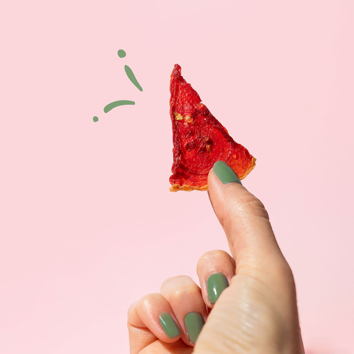 Vodní meloun a přitom bez vody? Jasně! Zbavil jsem se vody a zůstala dokonale sladká a šťavnatá chuť, na kterou se vždycky tak těšíš. Jsem vykutálený a hravý chips, který si z mého kulatého já nechal jen to nejlepší.