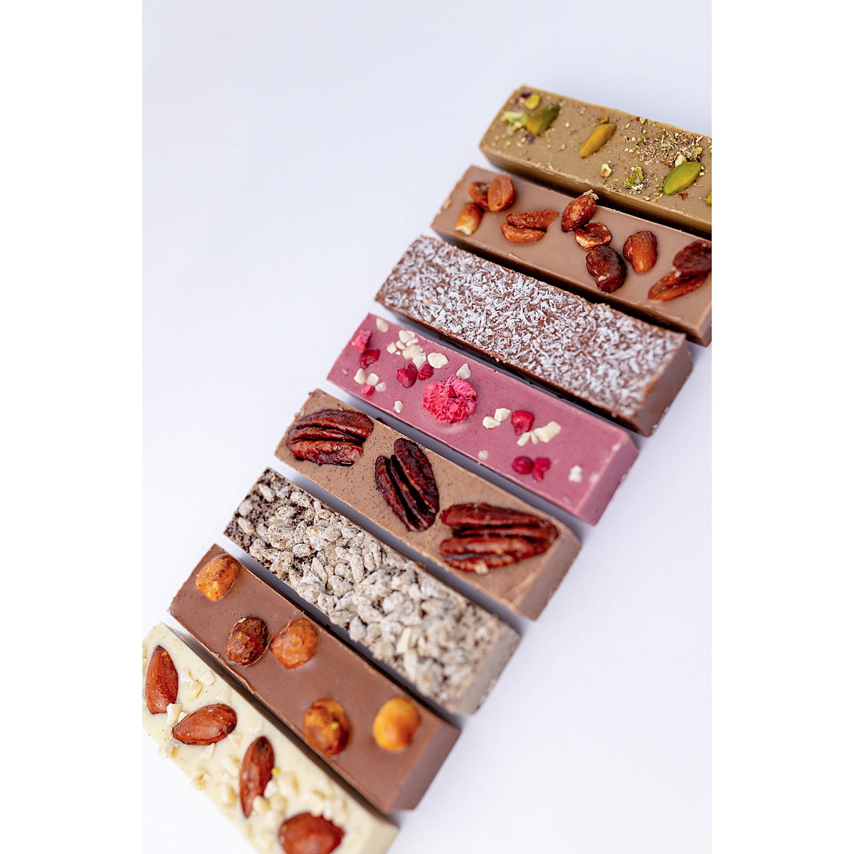 Hraji barvami, chutěmi, jsem krémový i křupavý – tolik možností! Jsem totiž ten nejjemnější čokoládový nugát, který potěší každý mlsný jazýček. Oříšky, ovoce, vanilka nebo káva? Co kousek, to unikát, ale smlsneš si na každém.