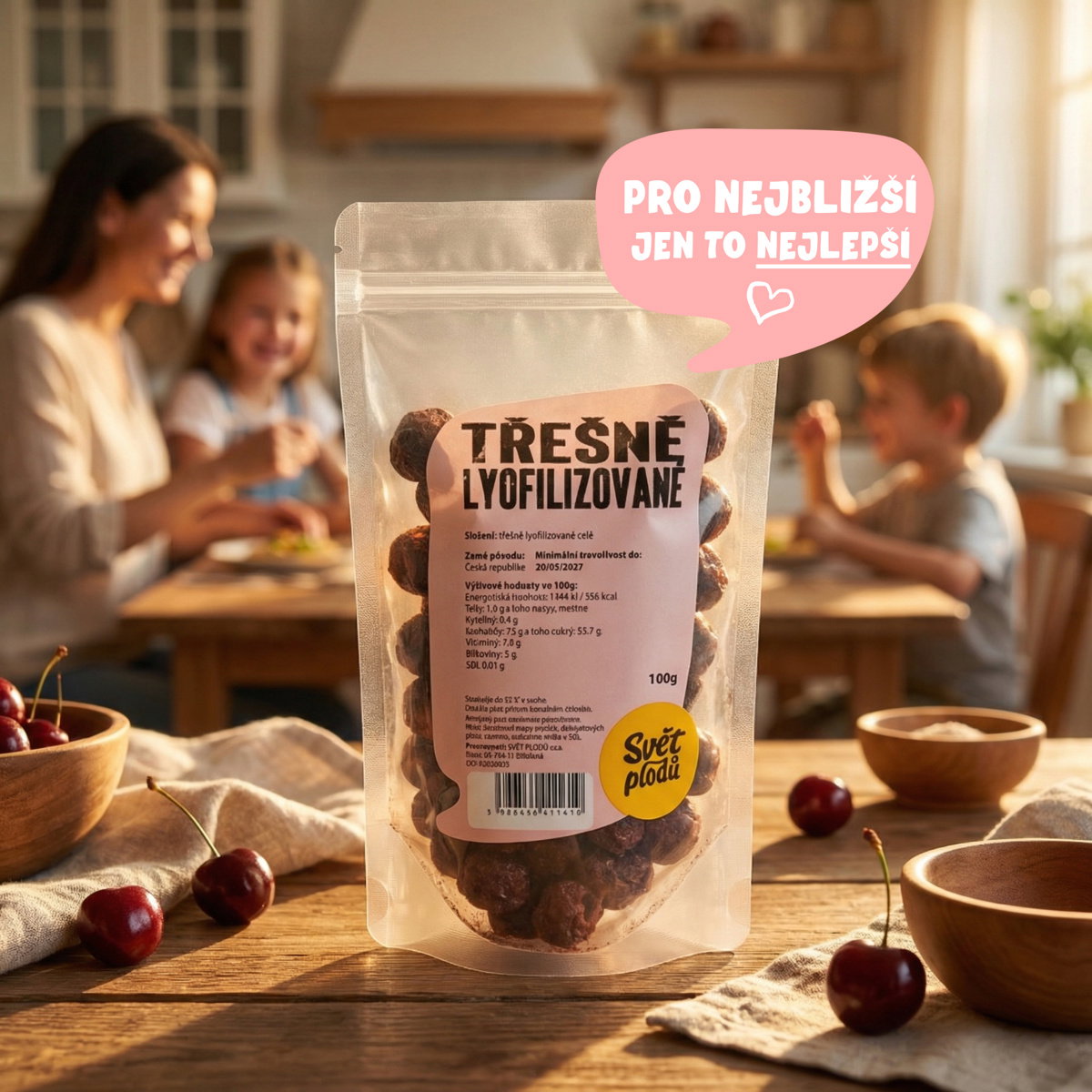 Nejsem žádná obyčejná třešeň! Jsem velká, sladko-kyselá a křupavá bomba plná svěží chuti. Mrazem usušená, takže si zachovávám šťavnatou chuť i vůni čerstvých třešní a přitom tak neodolatelně křupu!